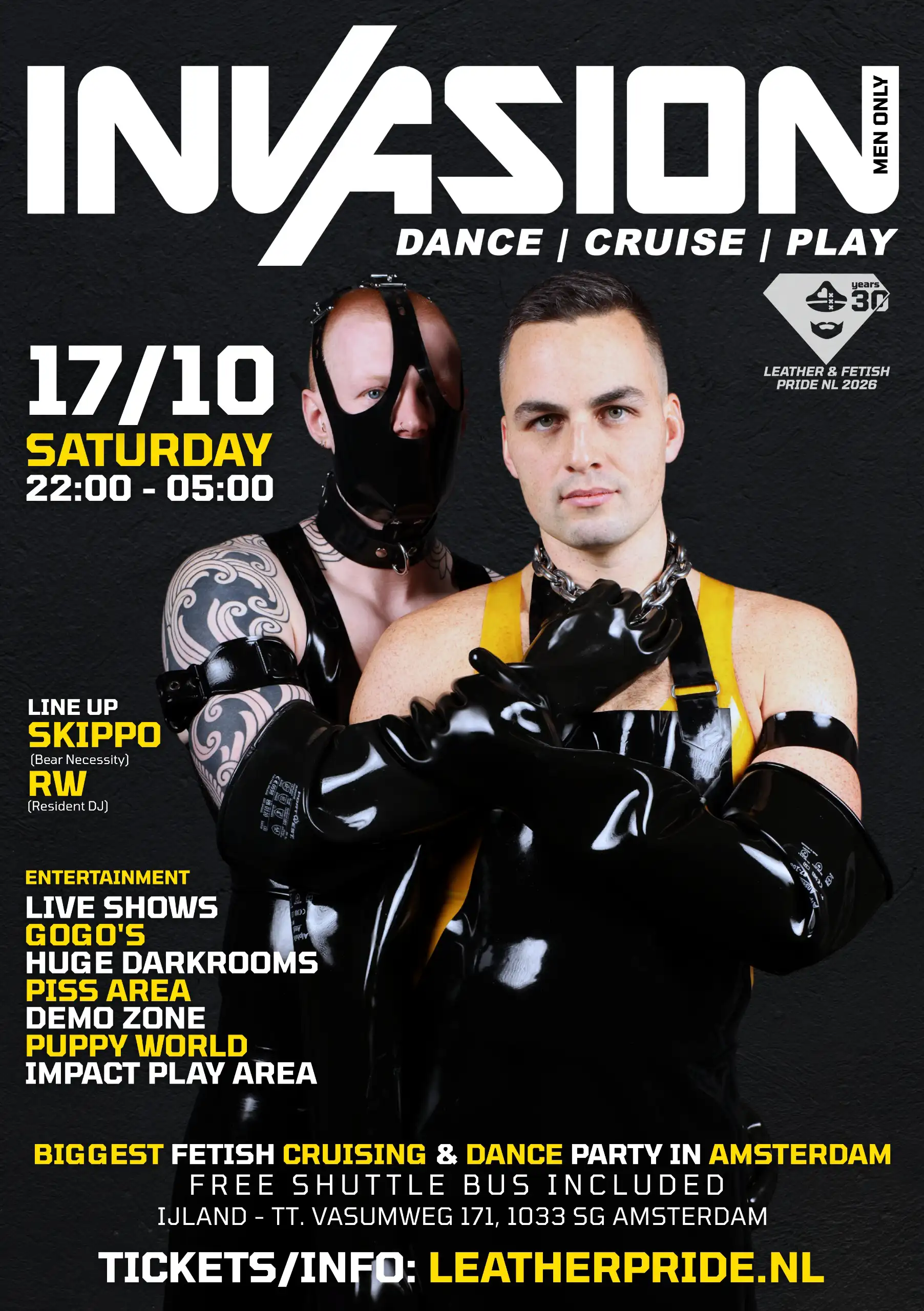 2025 was a blast! Invasion — a men-only fetish party in Amsterdam for those who live and breathe the fetish lifestyle — took over the city once again. Held during Leather & Fetish Pride weekend, it ignited Saturday night with raw energy of men from across Europe. Here’s a glimpse of what you missed.
